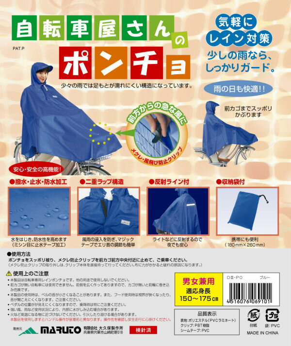 【雨の日の新提案】MARUTO(大久保製作所)(自転車屋さんのポンチョ)自転車用レインコート 価格: 1,780円 製品仕様●サイズ 適応身長:150?175cm(男女兼用)●重 量 510g●素 材 ポリエステル●少しの雨ならしっかりガード!雨の日も快適で気軽にレイン対策が出来ます。●前カゴまですっぽりかぶるワイド設計です。●前方からの急な風に対応した、めくれ・風飛び防止クリップ付きです。●ミシン目にシープテームで止水加工が施されています。●もちろん撥水、防水加工済みです。●二重ラップ構造で雨風の侵入を防ぎ、マジックテープで襟首の調節も簡単です。●背中にはライトに反射して夜でも安心な反射ライン付きです。●携帯にも便利な収納袋付きです。送料について●本商品は送料¥700(税込み、北海道、沖縄、離島を除く全国 (更新日時:2011/01/01 12:43) Supported by 楽天ウェブサービス |
